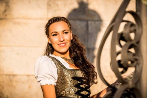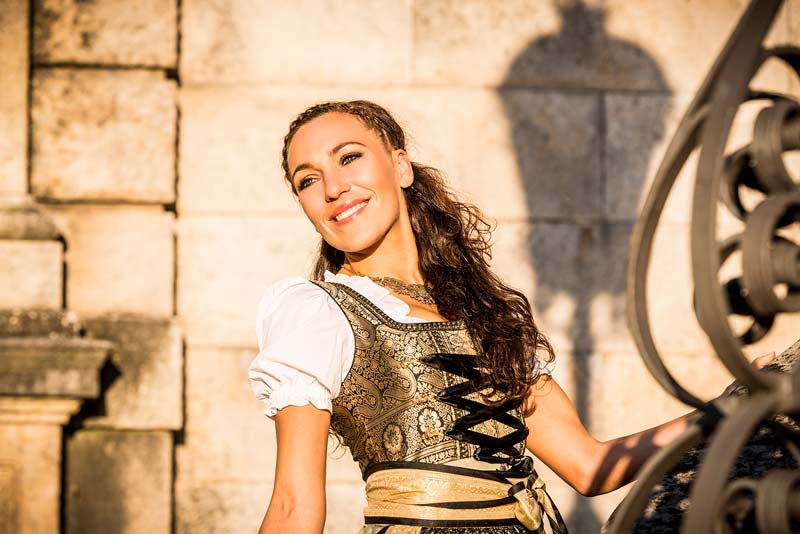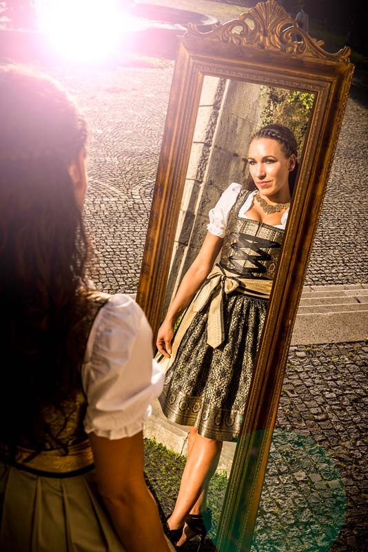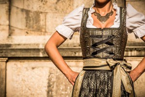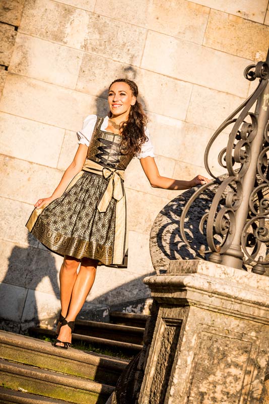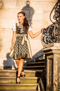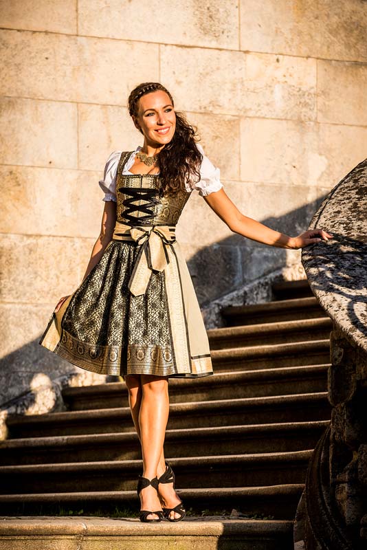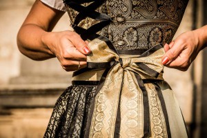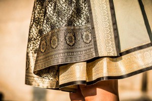 Ein graziöses Design aus glänzenden Sari-Stoffen in Gold, Schwarz und Olivgrün. Mit goldener und schwarzer Borde aus Spitze rundet die Schürze die Kreation harmonisch ab.